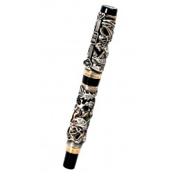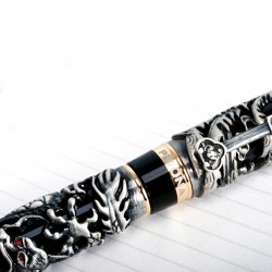 Comprend : Coffret cadeau comprenant 1 stylo roller Dragon avec corps et capuchon noirs avec éléments orientaux dorés gravés en relief et yeux de dragon rouges, capuchon amovible, système d'écriture roller, logo de la marque gravé sur l'anneau central et 1 étui à stylo avec extérieur rembourré et intérieur doublé d'un logo argenté.