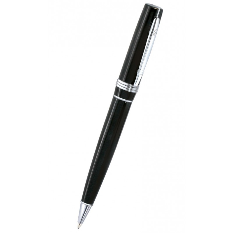 Comprend : un coffret cadeau comprenant 1 biros avec barillet et capuchon noirs, clip, capuchon tournant qui règle l'avance de la mine et logo de la marque gravé sur le haut du clip et 1 étui à stylo avec extérieur rembourré et intérieur doublé avec logo de couleur argent.