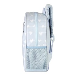 Comprend : 1 sac à dos bleu pour enfant avec un motif spécial de girafe sur fond de cœurs blancs, compartiment principal avec fermeture à glissière et tirette en tissu, doublure intérieure, poche latérale en filet pour la bouteille, bretelles rembourrées à taille réglable, bandoulière rembourrée, poignée de transport sur le dessus et carte d'identité personnelle.