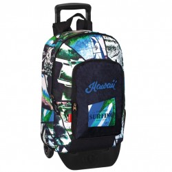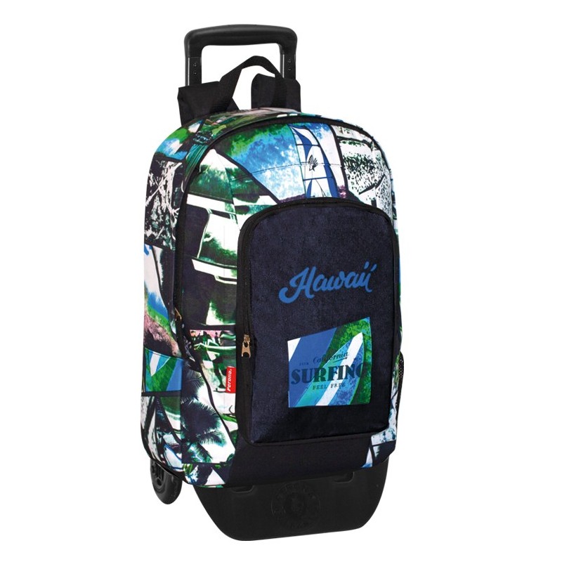 Comprend : 1 sac à dos junior bleu et vert au design moderne, deux espaces principaux avec fermeture à glissière, poche frontale avec fermeture à glissière, doublure intérieure de protection, poche latérale avec porte-bouteille en filet, espace intérieur spécial pour ordinateur portable et tablettes, poignées rembourrées, respirant et de taille réglable, rembourrage dorsal, système caché pour chariot adaptable, poignée sur le dessus et bandes réfléchissantes sur les bretelles et 1 chariot avec rondelles pour la fixation à la base, rabat supérieur pour s'adapter aux sacs à dos, structure pliante et double axe avec revêtement antirouille.