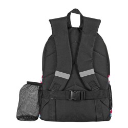 Comprend : 1 sac à dos junior Mask by Perona en noir, rouge et blanc avec impression spéciale et marques de couleur noire, compartiment principal avec fermeture à glissière et tirette en tissu, poche frontale avec fermeture à glissière et tirette en tissu, poche intérieure pour ordinateur, poche latérale en filet, doublure intérieure, bretelles rembourrées et respirantes avec taille réglable et bandes réfléchissantes, sangle pour les mains sur le dessus, rembourrage dorsal et système breveté adaptable au chariot de sac à dos Perona.
